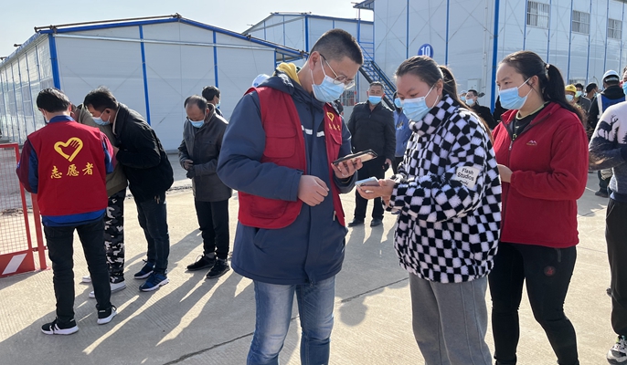 项目部与当地政府、县医院充分沟通协调,青年员工们主动作为,组成了一支贴心、细心、用心的志愿者队伍。在核酸检测开始之前,志愿者队伍积极协助医护人员完成核酸检测点布点工作,准备防控围栏、防疫物资、安排排队路线,画好一米线;检测时,志愿者们为受检人员提供扫码登记、秩序维护、检测引导等服务;检测后,志愿者们协助医护人员做好核酸检测试剂样本转运工作,保障核酸检测效率。截止3月27日,一共按照要求完成了12次全员核酸检测,累计检验7238人次。